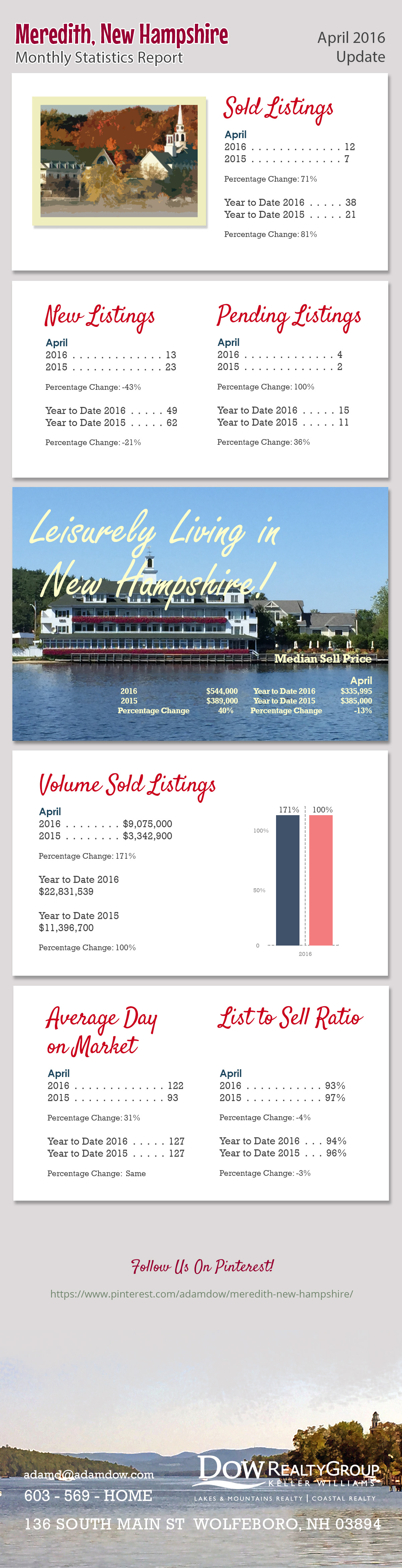 The following is the monthly statistics report for the town of Meredith as of April 2016.